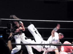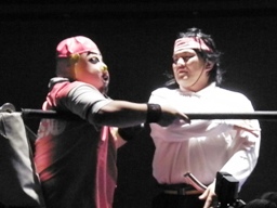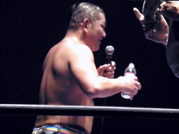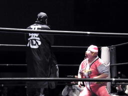 鈴木がキッダーニに水を飲ませ(左写真)、菊タローがスタナー。キッダーニ豪快に水を噴射。