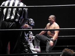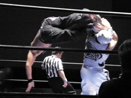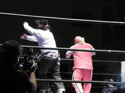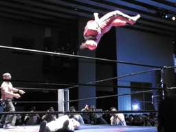 Rionロープに振る、ヴァイスハンドスプリングエルボー(左写真)。菊タローと鈴木にタッチ。