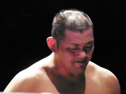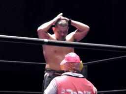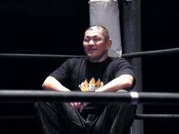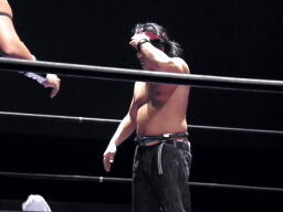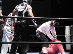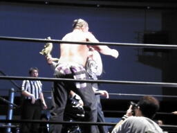 いつの間にか着替えた鈴木がリングに戻ってきている。ほんとに「ONE PIECE」好きなんだな(右写真)。