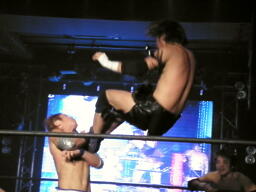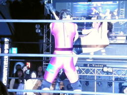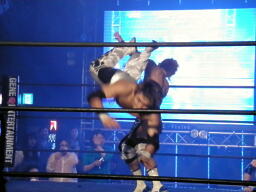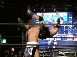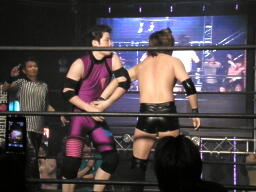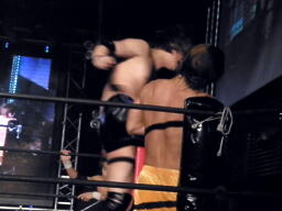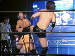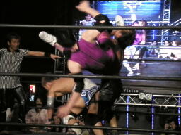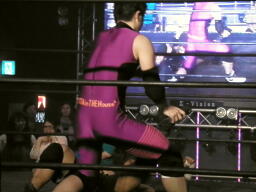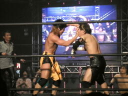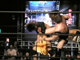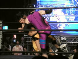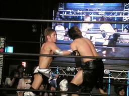高梨ロープに飛ぶ、正岡カウンターのショルダーブロックで倒す(右写真)。正岡ロープに振る、高梨切り返し、正岡の鼻をつかんでチョップ。