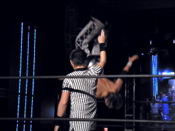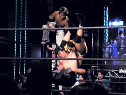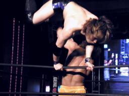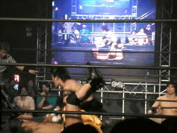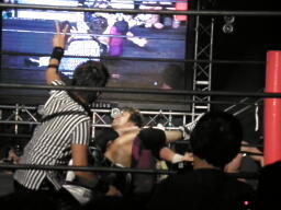 藤田が大石にウラカン・ラナ、矢野が藤田に啓ちゃんボンバー、円華が矢野にジャンピングハイキック、高梨が円華にトラースキック、正岡がコーナーに上る、必殺技6連発の最後の正岡がコーナーから転落(左写真)、失敗。あー、これはがっかり。
