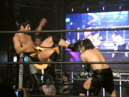 高梨ストンピング、コーナーに振って突っ込む、正岡カウンターのキック、高梨キャッチ(左写真)して振り回すと正岡はターンバックルの方を向く。
