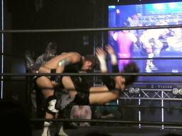 高梨その背中に串刺しドロップキック(右写真)、カウント2。大石にタッチ。5分経過。