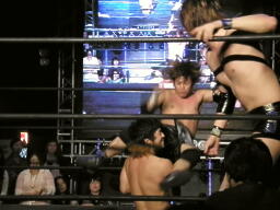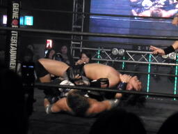 藤田が高角度シャイニングウィザード、続いて正岡もシャイニングウィザード(左写真)、大石がカット。10分経過。
