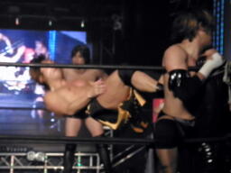 円華ロープをくぐろうとする、高梨ロープを蹴って急所攻撃、倒れ込んだ円華に高梨イナヅマ(右写真)、矢野にタッチ。円華も藤田にタッチ。