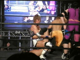 大石ストンピング、正岡立ってエルボー、大石もエルボー返す。正岡ロープに飛ぶ、大石回転して足を取るとテキサスクローバーホールド(左写真)、正岡ロープ。