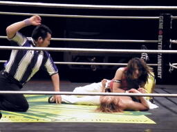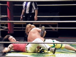 そしてフィッシャーマンズスープレックス狙う、千賀ブロック。千賀ソバット、ロープに飛ぶ、凛音ミドルキックからフィッシャーマンズスープレックスホールド(左写真)、カウントは1。