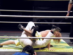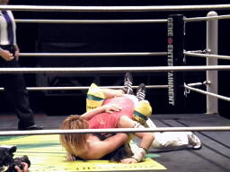 千賀切り返してハンマーロックに(右写真)、凛音足をすくって上になる、ドラゴンスリーパーに。