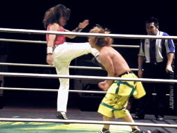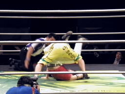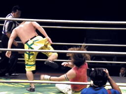 千賀張り手連打(左写真)、ローキックでダウンさせカバー、カウント1。