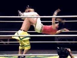 凛音はコーナーに上って美月サルト、千賀かわしてドロップキック、トラースキック(右写真)、カウント2。