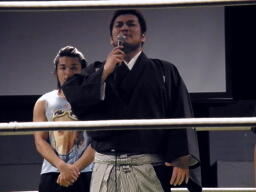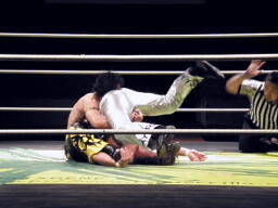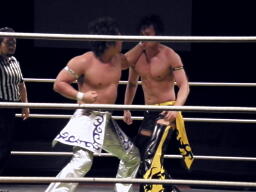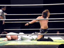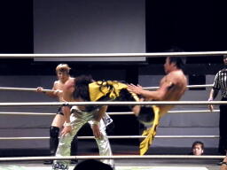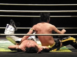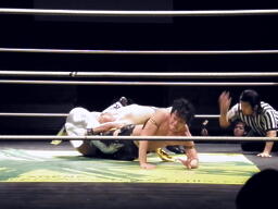 HARASHIMA蒼魔刀に行くがKUDOかわして回転エビ固め(右写真)、カウント2。