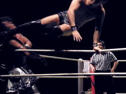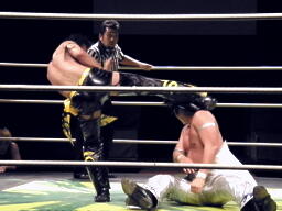HARASHIMA山折り狙って肩に担ぐがKUDO着地してバズソーキック(右写真)、カウント2。