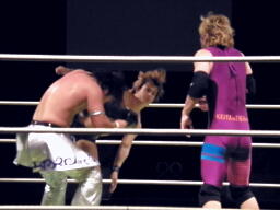 矢野ロープに飛んで啓ちゃんボンバー(右写真)、4人ともダウン。残り試合時間1分。