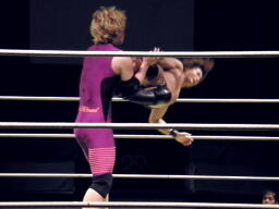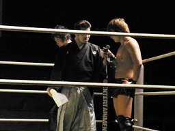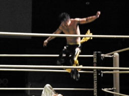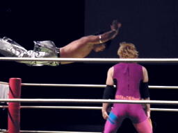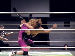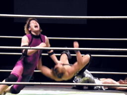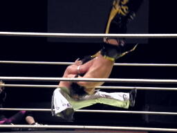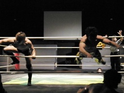 KUDOコーナーに上る、HARASHIMA追うが円華が背後から捕らえてパワーボムに(左写真)。