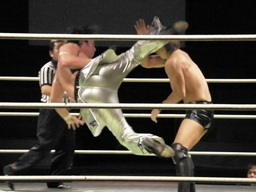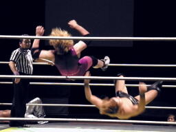 矢野張り手、HARASHIMAスワンダイブプレス(右写真)、カウント2。