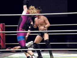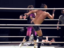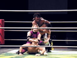 HARASHIMAがKUDOにコブラツイスト、矢野が円華にフェースロック(右写真)、レフェリーがブレーク。17分経過、残り試合時間3分。