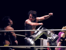 HARASHIMAと矢野がダブルのクローズライン、円華かわしてHARASHIMAにドロップキック(右写真)、HARASHIMA場外転落。