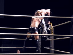 矢野サミングで形勢逆転、持ち上げてトップロープにギロチンスロー(右写真)。
