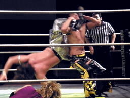 HARASHIMAとKUDOエルボーの打ち合い(右写真)、KUDOバックスピンキックで倒し円華にタッチ。