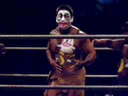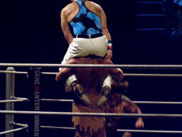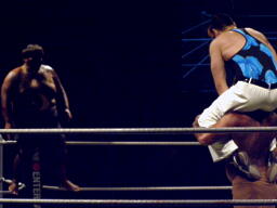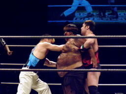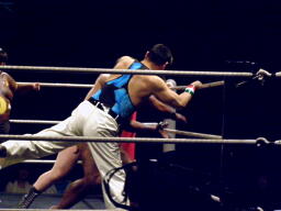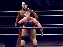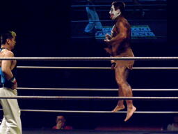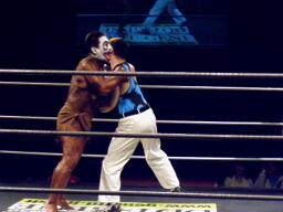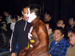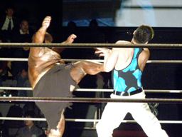 PIZAがフットーシにチョップ(右写真)、効かない。しかし2人で足を踏むと「痛ったあ・・・」となぜか日本語。