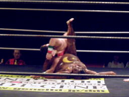 ジャンプして背面アタック(左写真)、松井レフェリーを追いかける。松井が逃げたのでフットーシにタッチ。