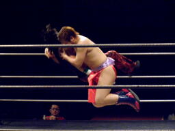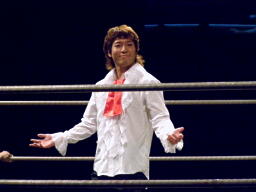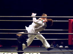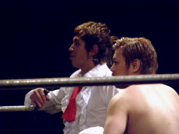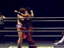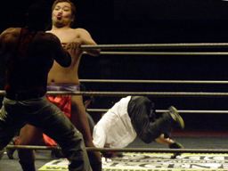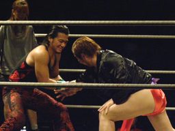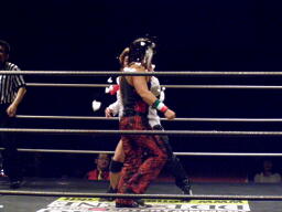 先発はルイ様とトーゴー。トーゴーバック取る、ルイ様優雅に切り返して腕を取る(右写真)、ヘッドロック。トーゴー切り返してヘッドロック。ルイ様ロープに振る、トーゴーはロープワークからルイ様をキャッチしてフライングメイヤー、ルイ様ヘッドシザーズ、ブレーク。両軍タッチ。