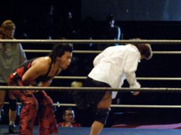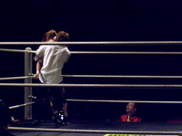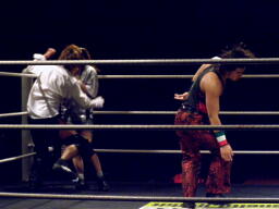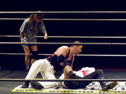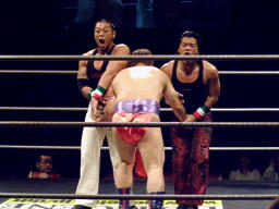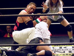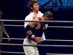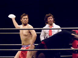 ルイ様逆水平、キック、逆水平。ガッバーナコーナーに押し込む。ルイ様のズボンが簡単に破れ(左写真)「貧乏貴族」疑惑浮上。ガッバーナはトーゴーにタッチ。