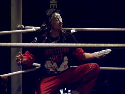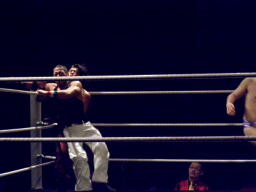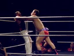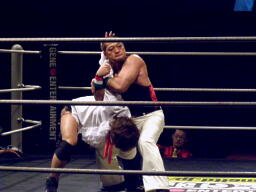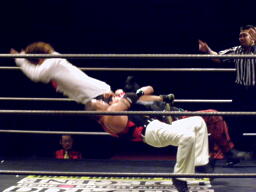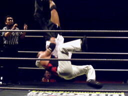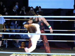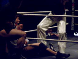 トーゴーパンチ、メキシカンストレッチ(右写真)。ディーノが入る、トーゴー睨みつける、ディーノコーナーに戻る。5分経過。
