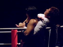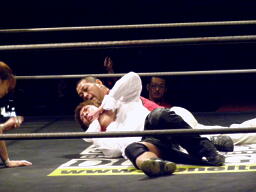 トーゴーナックル、ロープに振ってドロップキック、カウント2。再度ロープに振ってスリーパー(右写真)。グレースが「ギブアップ?」と聞くとルイ様「ノー!」そこは「ノン」と言って欲しかった。ルイ様ロープ。トーゴーはガッバーナにタッチ。