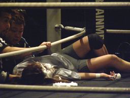デスケーキの威力はすさまじくグレースはピクリとも動かない(左写真)。松井レフェリーが代わって試合を裁くことに。