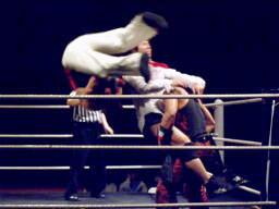ディーノがルイ様を抱え上げて合体ギロチンドロップ(右写真)、カバーはトーゴーがカット。