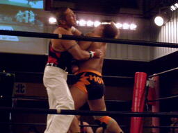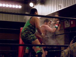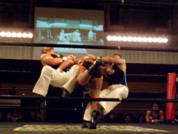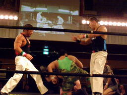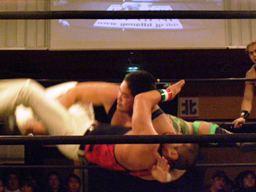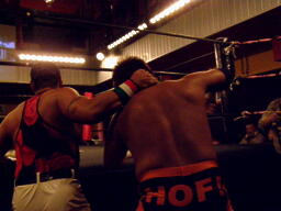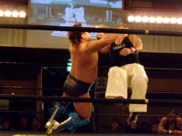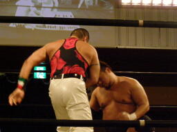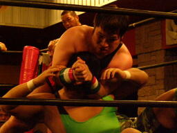 トーゴーヘッドロック、高井ロープに振る、ショルダーブロックの打ち合い(右写真)。高井はトーゴーのラリアットをかわしてショルダーブロック。入江とアントンにタッチ。
