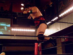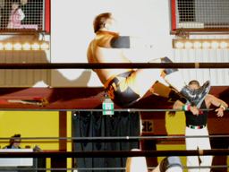 入江ラリアット、アントンかわしてパンチ3連打からダスティ、アントンコーナーに上ってダイビンフィストドロップ(右写真)、高井と松永がカット。