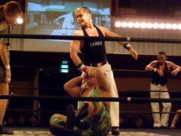 入江ロープに振る、アントンテーズプレスからエルボードロップ、カウント2。I4Hはコーナーに振って串刺しエルボー3連発。3人トラースキックからアントンがカバー、カウント2。アントン入江を肩車しようとするが上がらない(右写真)。