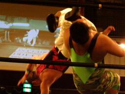 高井背中にパンチ、踏みつけ。ボディスラムから「アンコ型プレス!」と叫んでセントーン(右写真)、カウント2。入江にタッチ。入江ボディスラムに行こうとするがアントンは首固めに、カウント2。アントンサミング、首投げから顔面踏み付け、PIZAにタッチ。