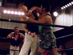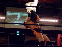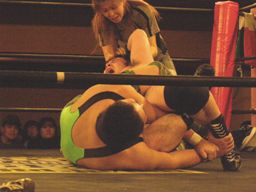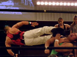 松永ロープに振る、トーゴー切り返してニーリフト、PIZA呼び込む。ダブルでロープに振ってPIZAカニばさみからSTF、さらにトーゴーのクロスフェースが合体(右写真)、入江がカット。