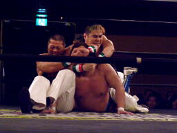 アントン首投げ、PIZA入ってアントンとダブルの腕十字、トーゴーがアキレス腱固め(右写真)、レフェリーのチェックが入る前に高井がカット。