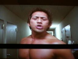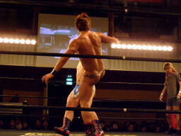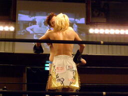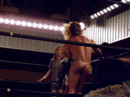 鳥羽ディーノを突き放すがディーノはロープでハネ返り再度鳥羽にキス(左写真)。