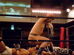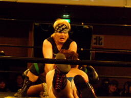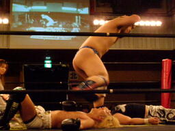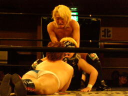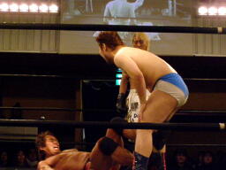 ウラノ鳥羽に首投げからドロップキック(右写真)、カウント2。