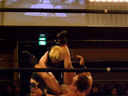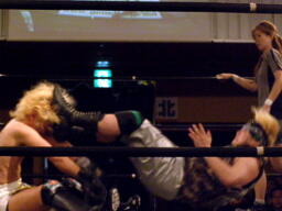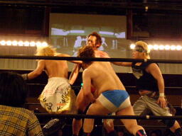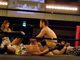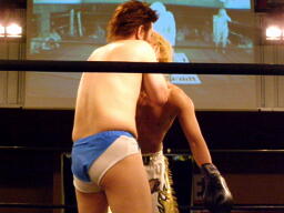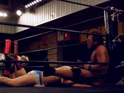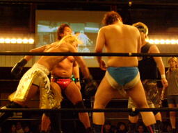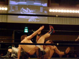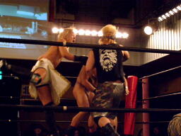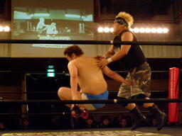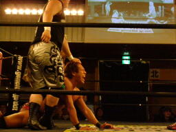 さらにウラノがカニばさみでディーノを倒しマイケルの股間に(左写真)。マイケル場外エスケープ。