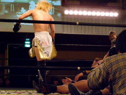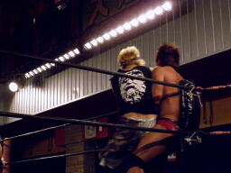 マイケルはディーノに再度片ヒザ着かせるとまたロープに飛ぶ、今度はウラノが場外から足を引っ張って倒す(左写真)。