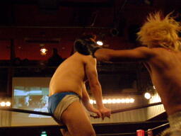 マイケルがロープに飛ぶと鳥羽がヒザ蹴り(左写真)。