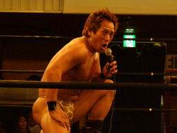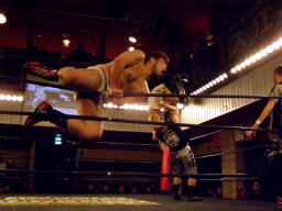 マイケルプロレスLOVEポーズ取りロープに飛ぶが鳥羽がカウンターのヒザ蹴り(右写真)、新技を阻止。