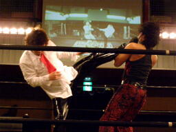 MIKAMIデュランダル(右写真)、塩田ふらつきながらイスに接近、MIKAMIがイスを蹴る。