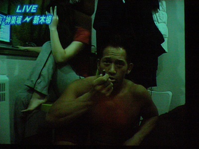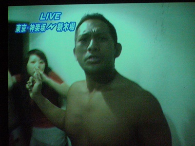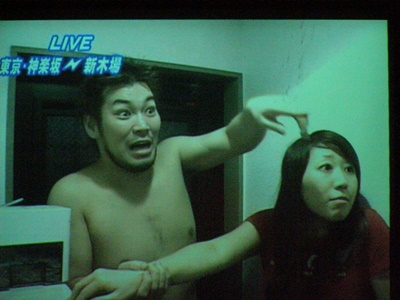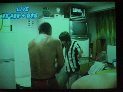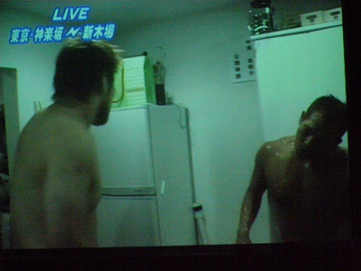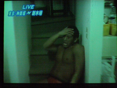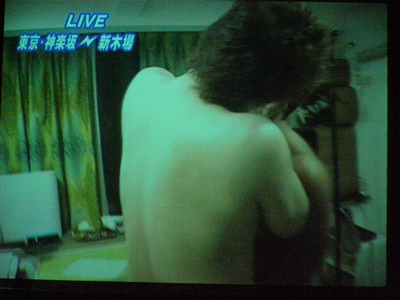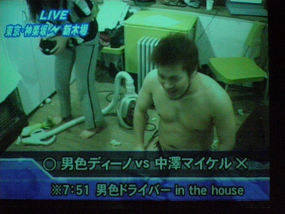 マイケルのタイツをむしり取るディーノ。画面にはモザイクが(左写真)。やはりニアライヴか。