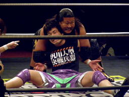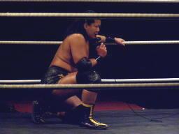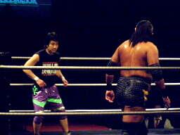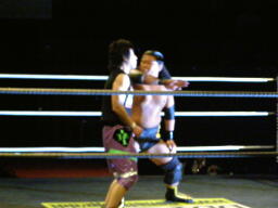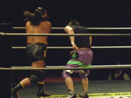 安部立ち上がってロープに押し込みなんとか大鷲を振るが大鷲はショルダーブロック(左写真)。大鷲場外に出して自分も降りる、安部はすぐにリングに戻るとドロップキック、プランチャ。