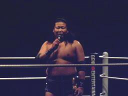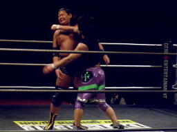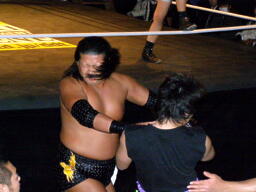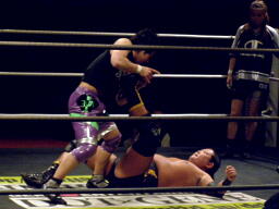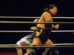 しかし大鷲はすかさずランニングチョークスラム(左写真)、ダイビングボディプレスを出すまでもなくカウント3。