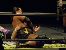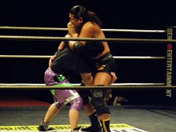 しかし安部は雪崩式ブレーンバスターに(右写真)、カウント2。10分経過。