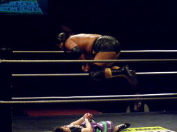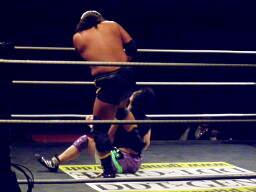 大鷲逆水平、安部前のめりにダウン、大鷲すかさずギロチンドロップ。仰向けになったところにさらにジャンピングボディプレス(左写真)、カウント2。