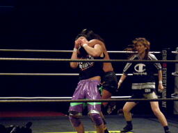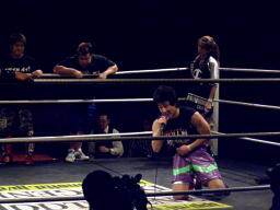 安部エルボー(右写真)、大鷲はエルボーにカウンターでキック。コーナーに詰めてチョップ連打、対角線コーナーに振ってコーナースプラッシュ。